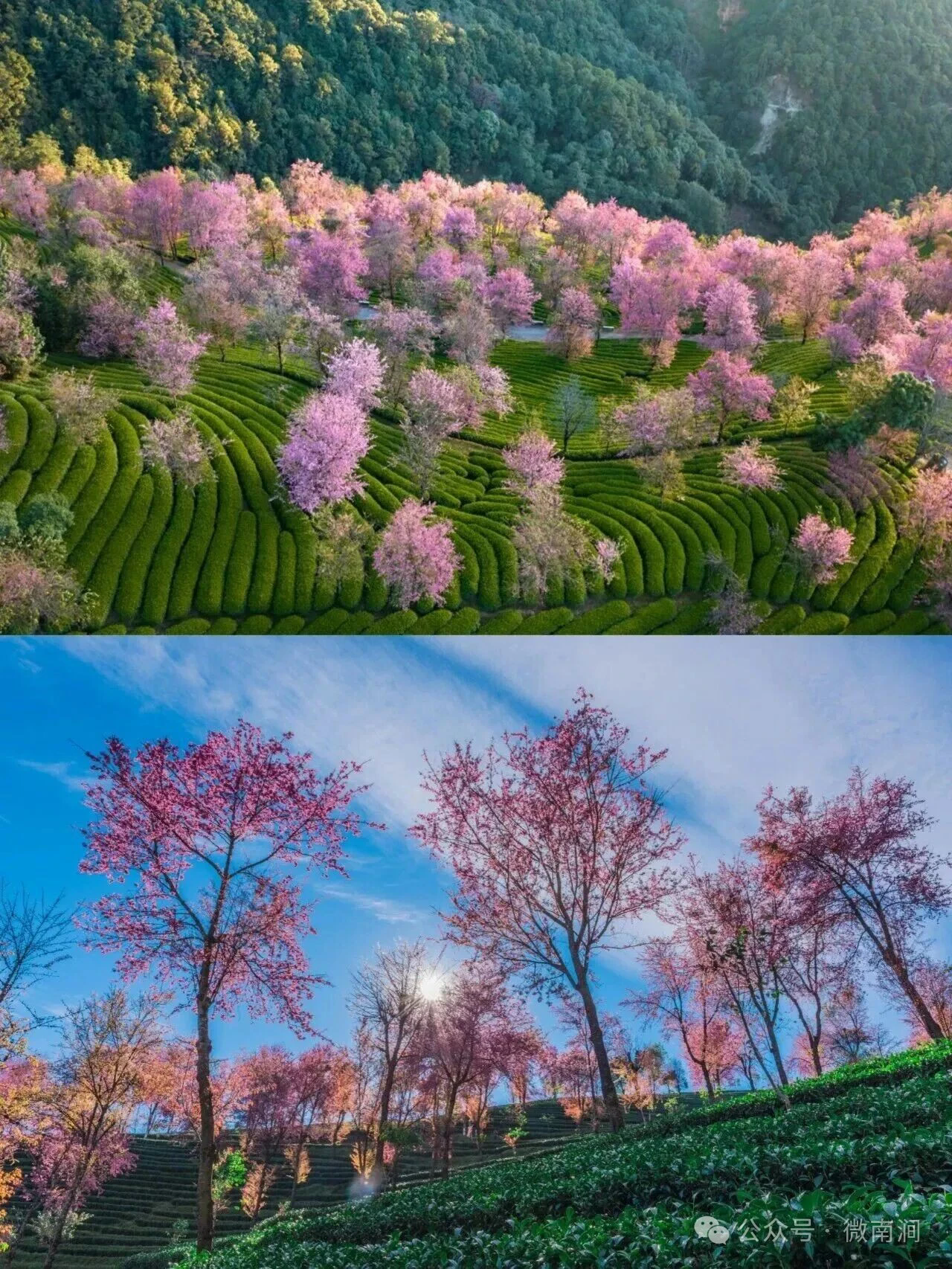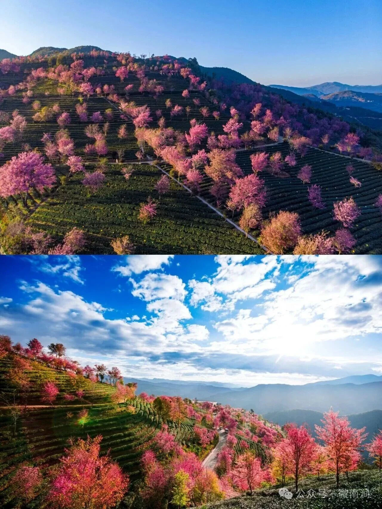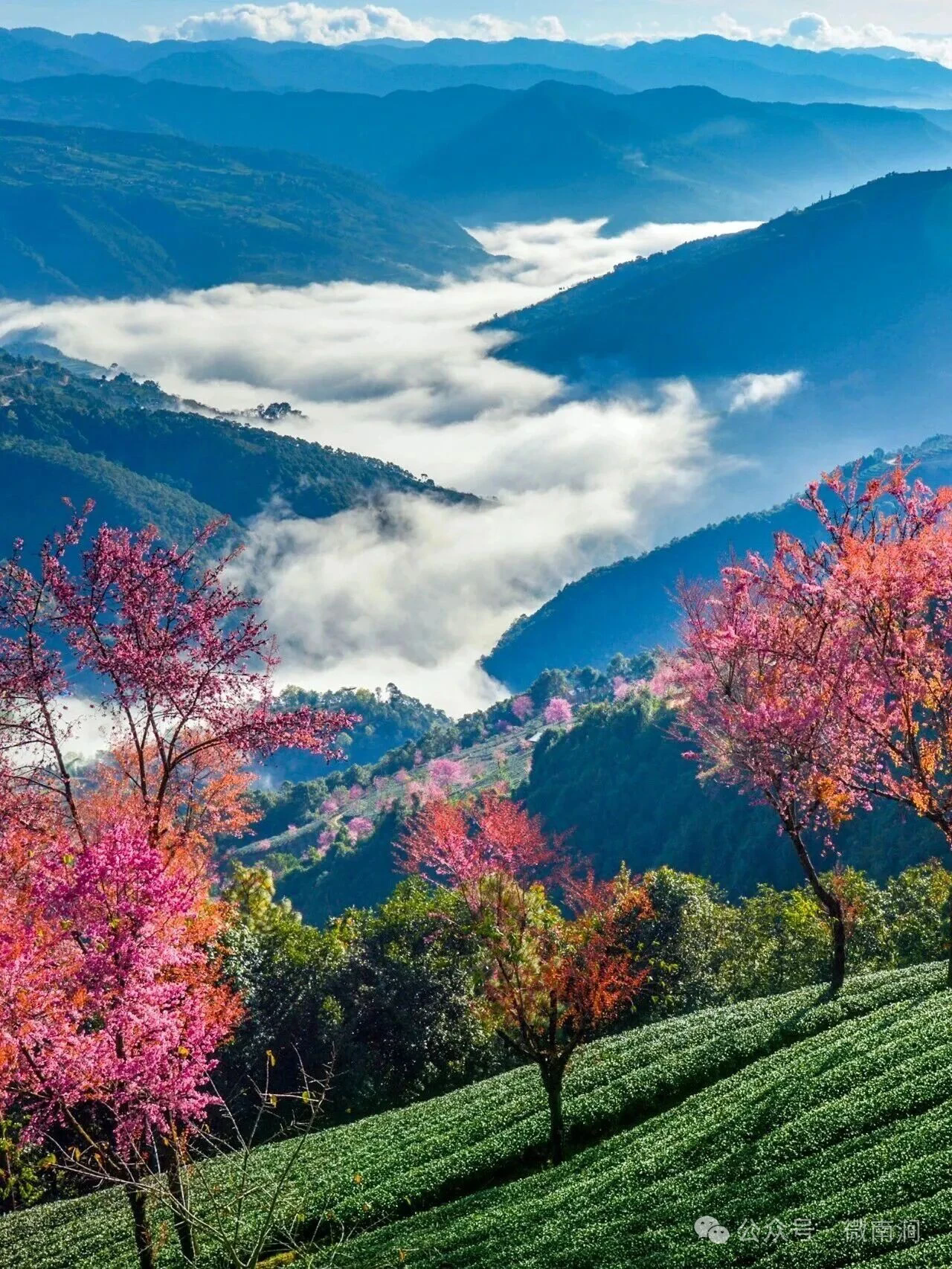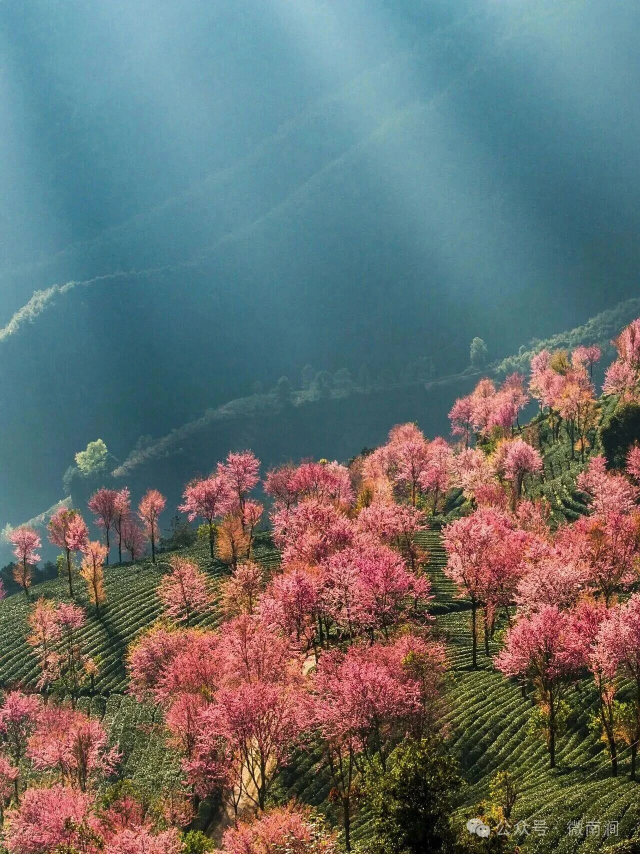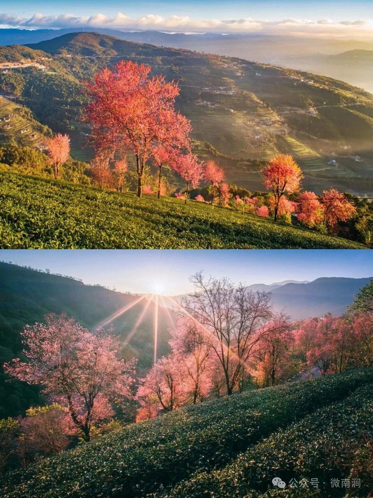 🌈在南涧无量山,12月整月,2000多亩的茶山开满樱花,尤其清晨的日出光线,真的美爆了!