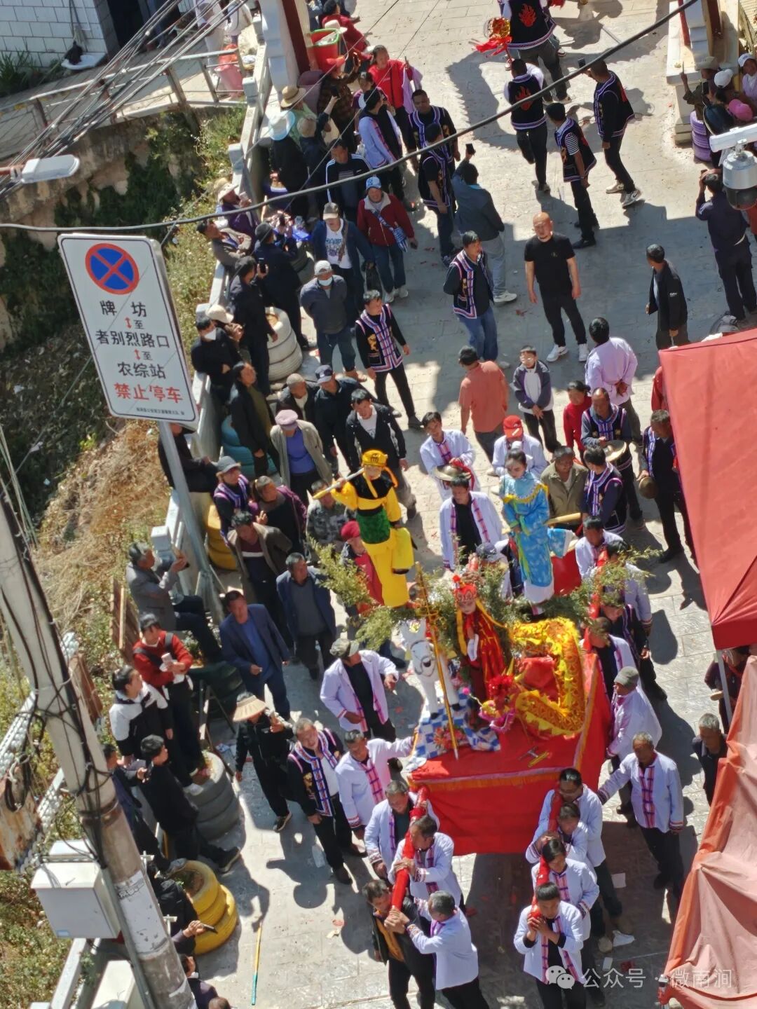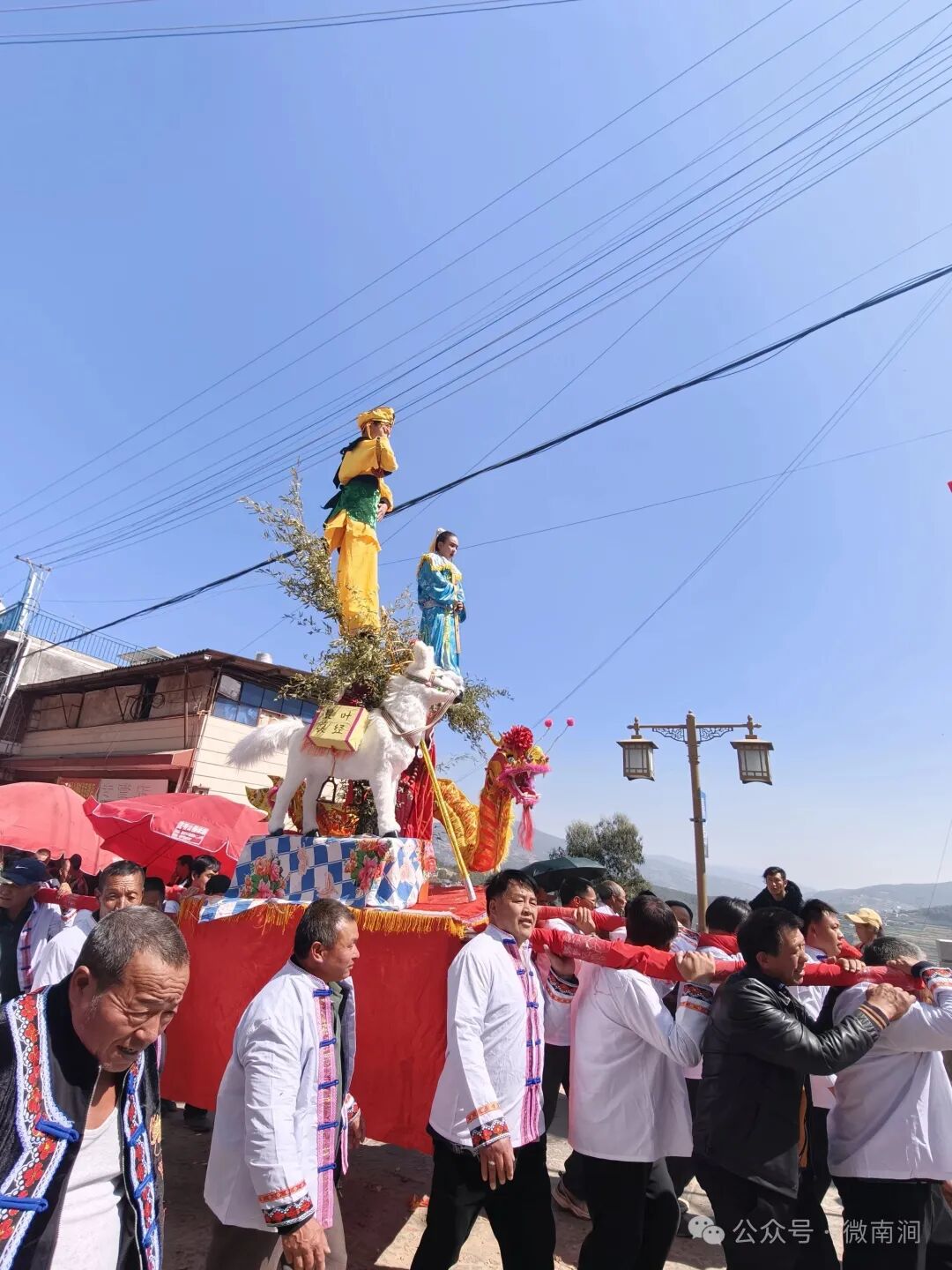 迎高台是拥翠乡龙灯会的特色项目,集戏剧、绘画、雕塑、装饰于一体,以传统故事为主题,通过精心装扮的人物造型和场景布置,再现经典传说,深受当地群众喜爱,有着悠远绵长、绚丽缤纷的生命力。今年的迎高台表演以《西游记》里的“白龙马驮经”为主题,师徒几人栩栩如生、惟妙惟肖。在涌动的人潮中,一阵激昂的锣鼓声由远及近,围观群众一直伴随迎高台和长龙两侧游走,汹涌的人群、震耳欲聋的爆竹声构成了热闹非凡的“龙灯盛景”。