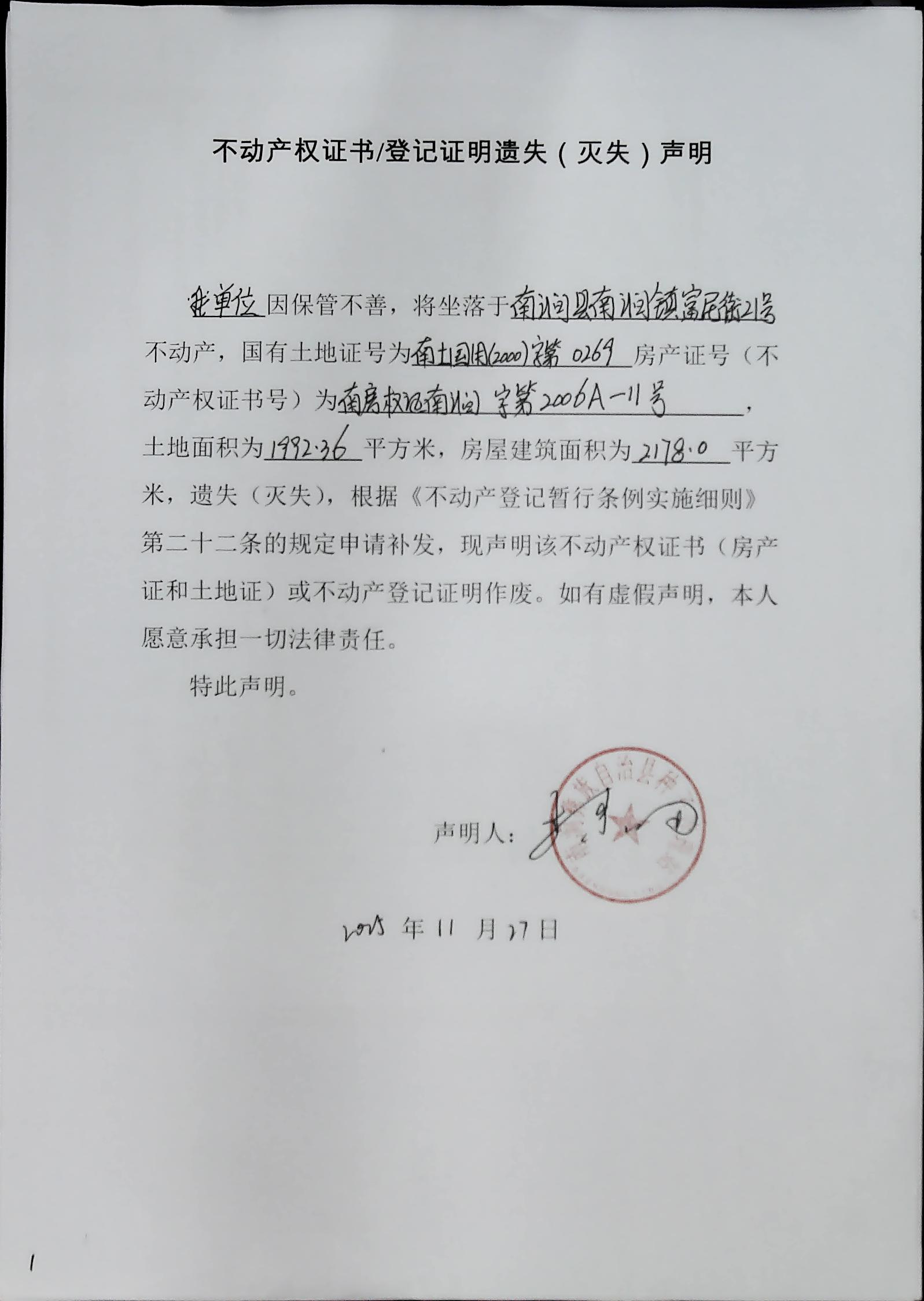 0014号不动产权证书遗失声明(南涧彝族自治县种子管理站)