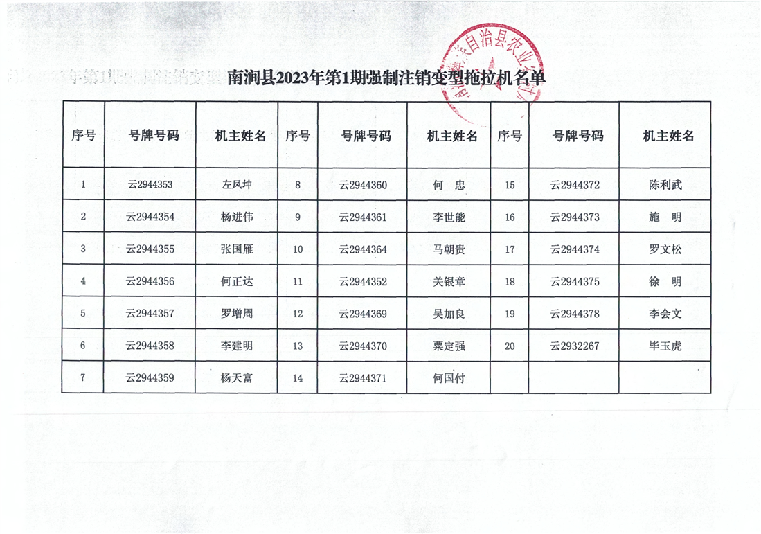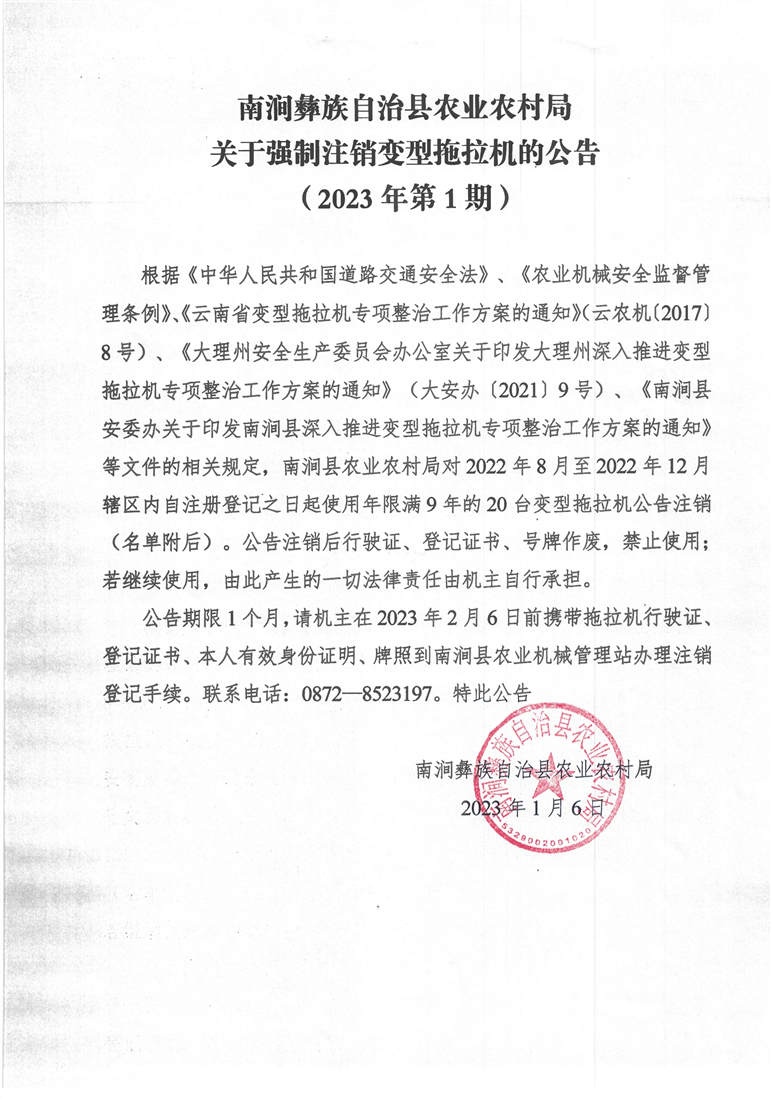 南涧县农业农村局关于强制注销变型拖拉机的公告(2023年第1期)