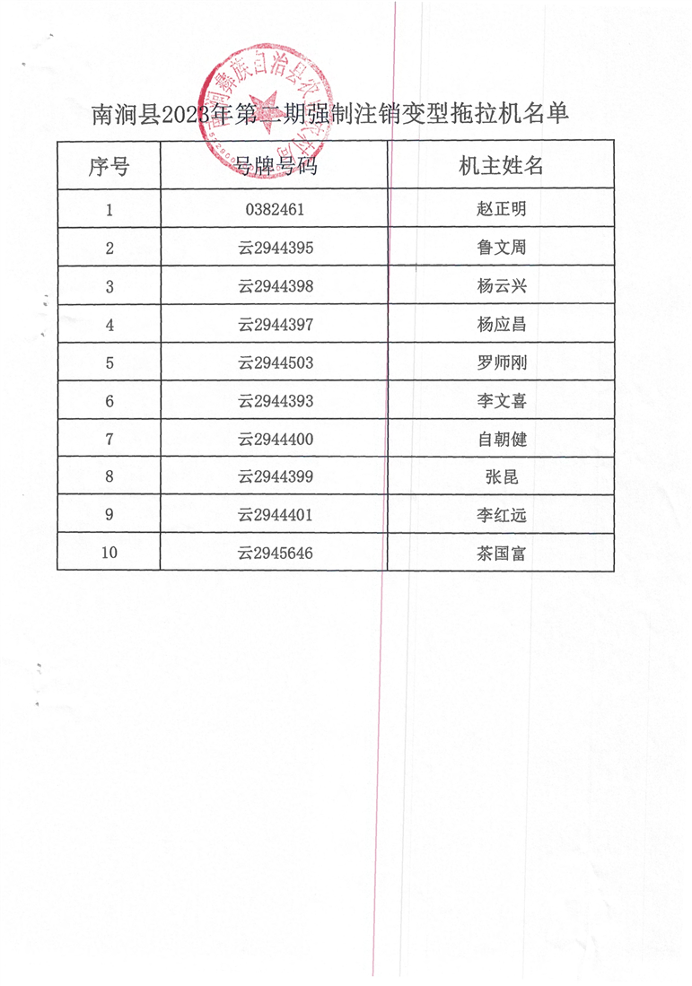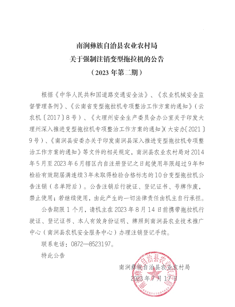 南涧县农业农村局关于强制注销变型拖拉机的公告(2023年第2期)