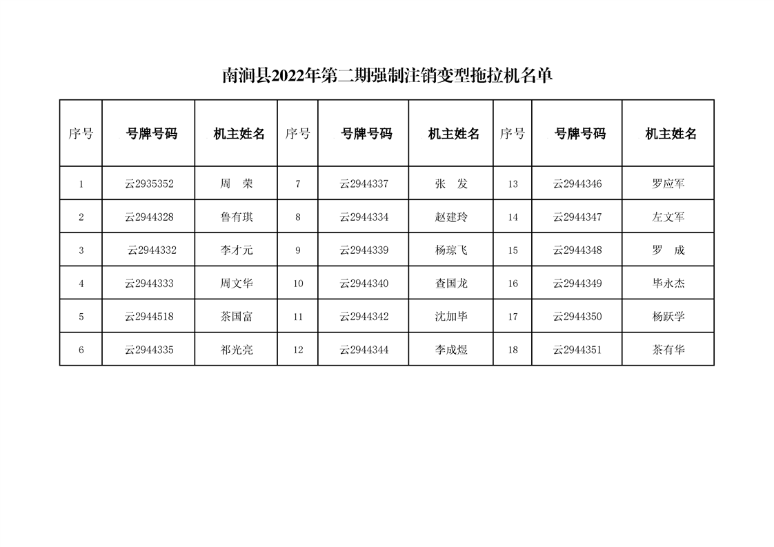 根据《中华人民共和国道路交通安全法》、《农业机械安全监督管理条例》、《云南省变型拖拉机专项整治工作方案的通知》(云农机〔2017〕8号)、《大理州安全生产委员会办公室关于印发大理州深入推进变型拖拉机专项整治工作方案的通知》(大安办〔2021〕9号)、《南涧县安委办关于印发南涧县深入推进变型拖拉机专项整治工作方案的通知》等文件的相关规定,南涧县农业农村局对2022年4月至2022年7月辖区内自注册登记之日起使用年限满9年的18台变型拖拉机公告注销(名单附后)。公告注销后行驶证、登记证书、号牌作废,禁止使用;若继续使用,由此产生的一切法律责任由机主自行承担。